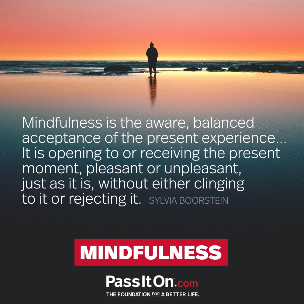 “Mindfulness is the aware, balanced acceptance of the present experience... It is opening to or receiving the present moment, pleasant or unpleasant, just as it is, without either clinging to it or rejecting it.”