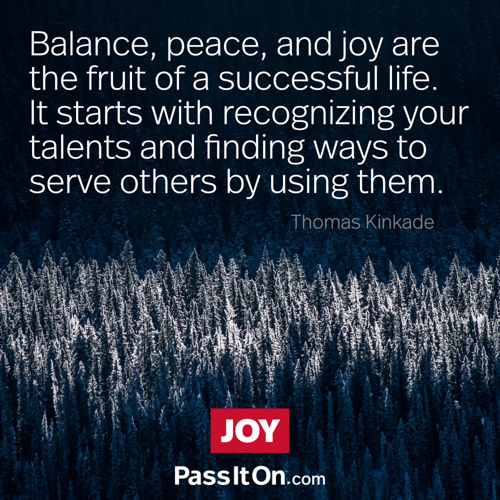 Balance, peace, and joy are the fruit of a successful life. It starts with recognizing your talents and finding ways to serve others by using them.  —Thomas Kinkade